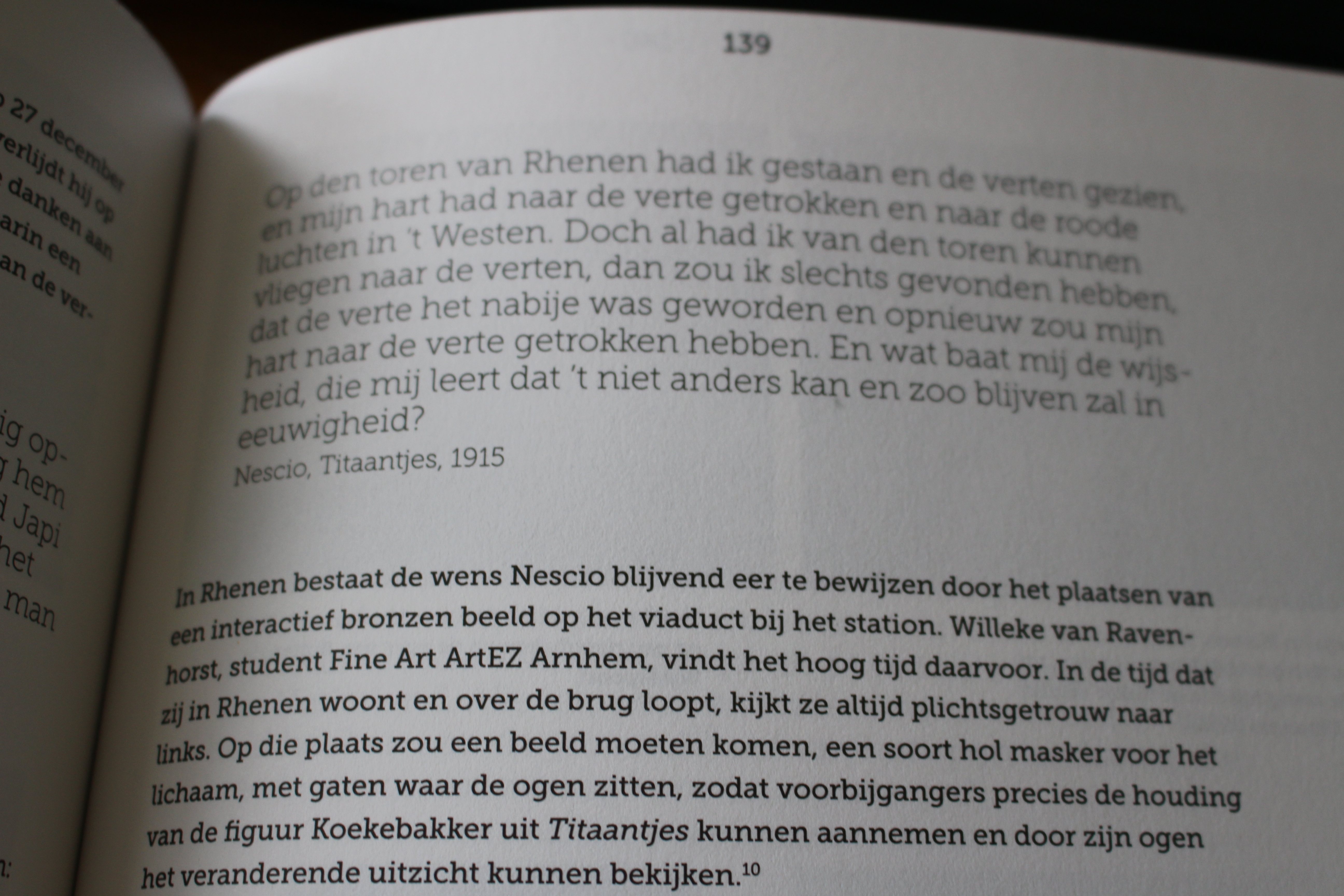 Niet dat ik nou zo een twee drie een verbinding tussen deze twee kan vinden, maar afgelopen donderdagavond 8 mei was ik aanwezig op de voorpremière van het boek Voetsporen – Op schrijverspad door het land van de grote rivieren van Wim Huijser in de bibliotheek in Wageningen. Dit omdat er een stukje in dit boek is opgenomen over mijn Nescio project in Rhenen. (zie deze page en deze post voor meer informatie hierover). Ik werd gevraagd een prachtig gedeelte uit Nescio’s Titaantjes voor te lezen, en daarnaast vertelde ik wat over het Nescio project. Wim Huijser introduceerde me door te beginnen over mijn onderzoek over de Romantische Ironie en vroeg me even in het kort te vertellen wat dat behelst. Nogal onvoorbereid op deze vraag, stond ik een beetje met mijn mond vol tanden. Een aantal mensen sprak mij aan het einde van de avond aan over de term en deze heb ik verteld naar mijn website te komen. Bij dezen verwijs ik geïnteresseerden graag door naar de pagina Research op deze website. Hierop staat een korte videopresentatie die ik over de beginfase van mijn onderzoek heb gemaakt. Binnenkort zet ik er een samenvatting van mijn onderzoek bij. Mocht u geïnteresseerd zijn in het onderzoek zelf, mail mij dan a.u.b. op wnvanravenhorst@gmail.com