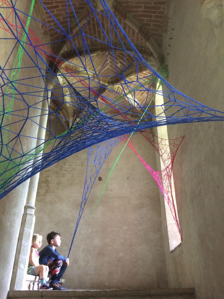Last Saturday 12 June saw the opening of the exhibition “Eigentijds vervlochten met MIJ” (Contemporarily interwoven with ME) by Museum IJsstelstein in which I am exhibiting among a group of fine colleagues with the site specific installation ‘Deponentia II’ which I have created with the assistance of Cornelius Grau in IJsselstein’s 16th century castle tower that serves as a satellite location to the Museum. I spent the two weeks leading up to the opening living and working in the medieval centre of IJsselstein, which proved an interesting and valuable experience. Being so immersed in this fairy tale like place which seems unreal most of the time, in its peculiar mix of ancient buildings, walls, stones and streets alternated with completely modern shopping and nightlife facilities breaking the spell, was an experience I will not soon forget. Imaginably it all found a way into the installation, which dances trough the space above the steps in the castle tower like a temporarily frozen mist, in its form of three differently brightly coloured intermingled spiderwebs. More images and video material will follow soon. The exhibition will be open throughout the summer until 17 September 2017. Open every Wednesday to Sunday from 13:00 to 17:00.