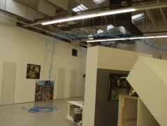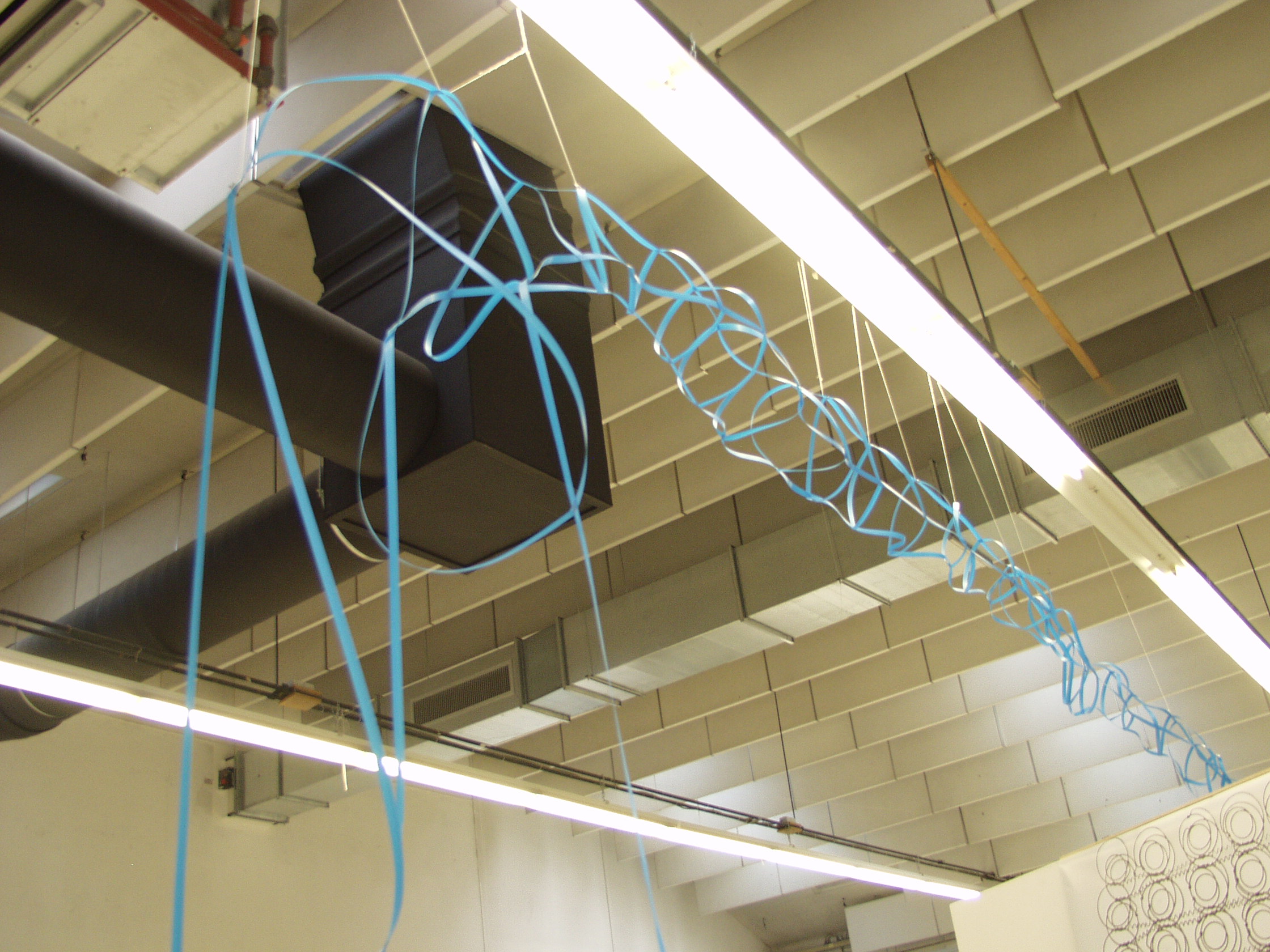 “Blue” is een site specific werk gemaakt in en reagerend op een tijdelijke tentoonstelling in de expositieruimte van de academie op de oude kraan in Arnhem. Het werk is gemaakt van blauw verpakkingsmateriaal dat gespannen verwerkt is in een constructie die doet denken aan infrastructuur, spoorbruggen, etc. De constructie reageert op al het werk in en op de opbouw van de tentoonstelling, alsmede op de ruimte waarin zich deze tentoonstelling manifesteerde. De tekst op de muur speelt mee met dit werk en met de tentoonstelling als geheel, welke het onderwerp van de stad als drager van door de mens gewenste maar tevens stokkende structuur behandelde.