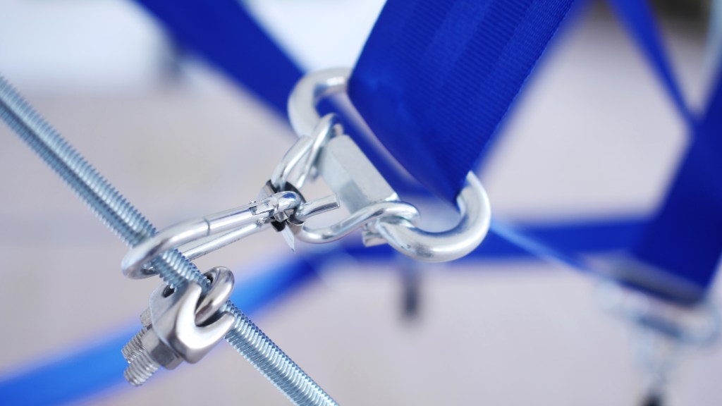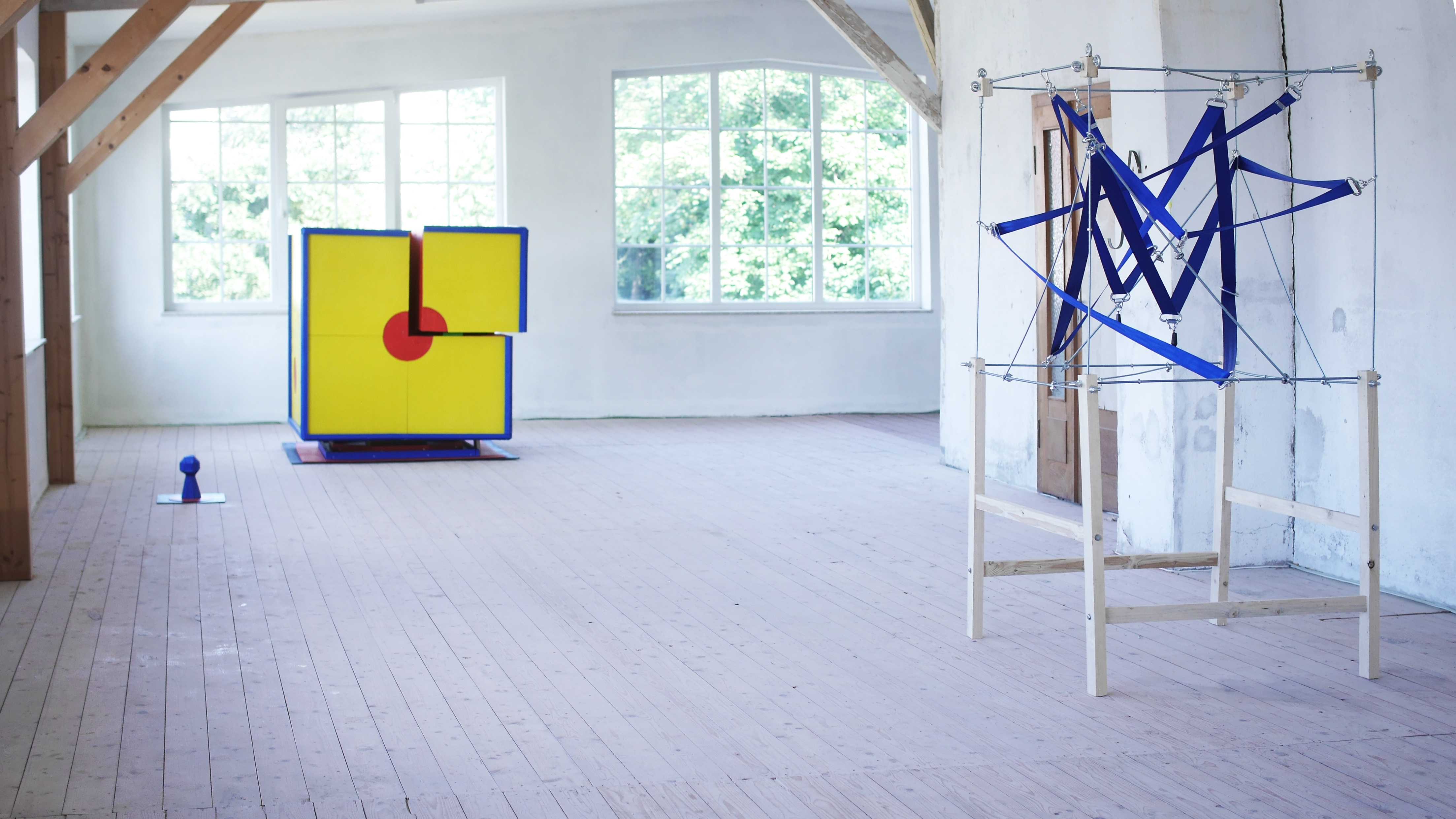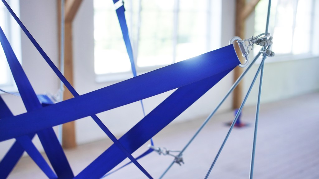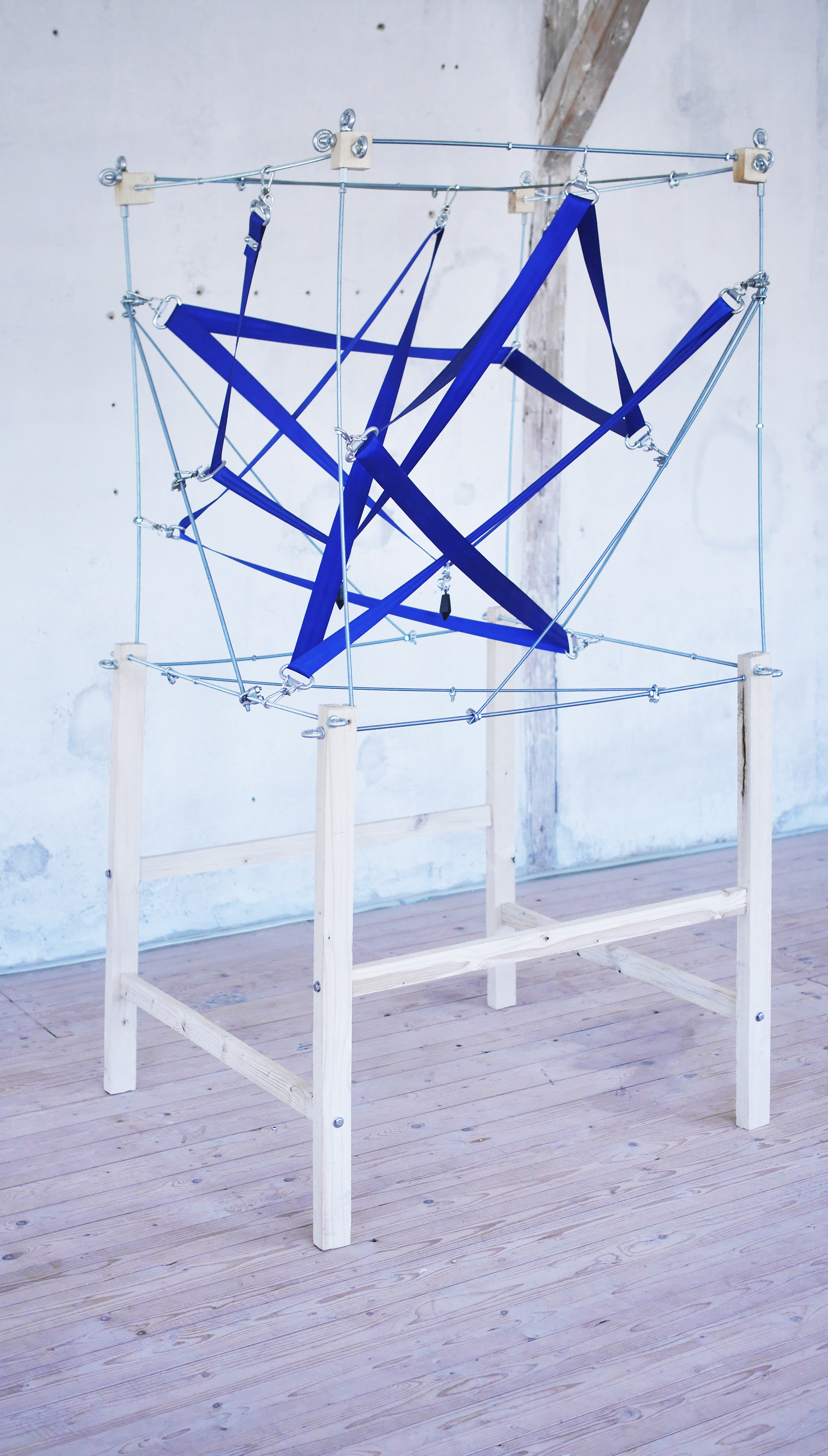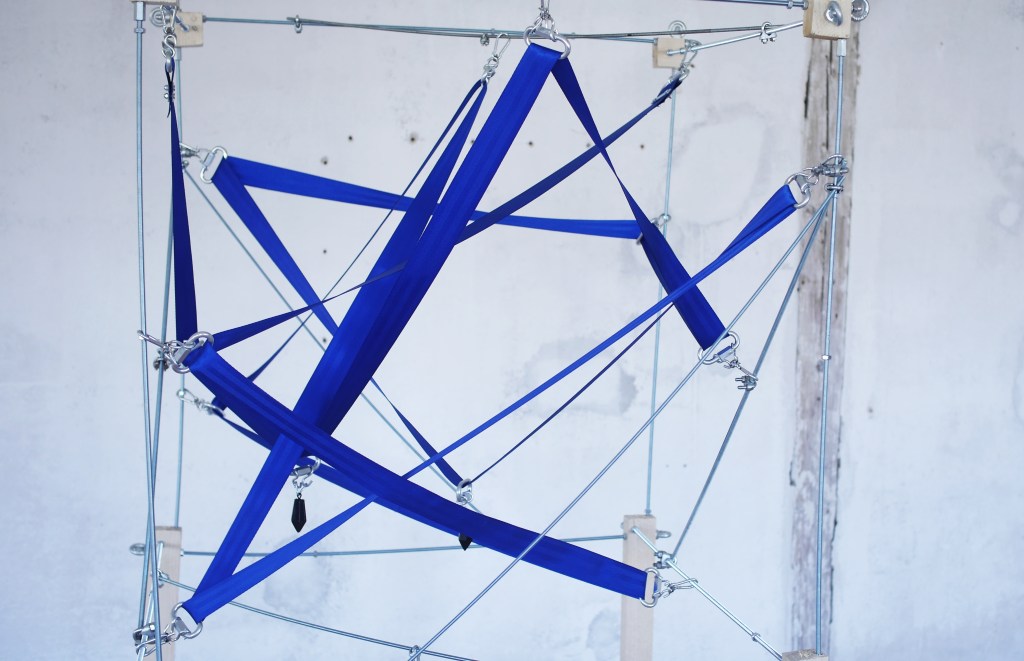 Blue | 2022 | wood, threaded metal rods, seatbelt, metal connection points, fishing weights | 1 x 1 x 2 mBlue (detail) | 2022 | wood, threaded metal rods, seatbelt, metal connection points, fishing weights | 1 x 1 x 2 mBlue (detail) | 2022 | wood, threaded metal rods, seatbelt, metal connection points, fishing weights | 1 x 1 x 2 mBlue (Exhibition view) | 2022 | wood, threaded metal rods, seatbelt, metal connection points, fishing weights | 1 x 1 x 2 m (work left: Cornelius Grau)Blue (detail) | 2022 | wood, threaded metal rods, seatbelt, metal connection points, fishing weights | 1 x 1 x 2 m