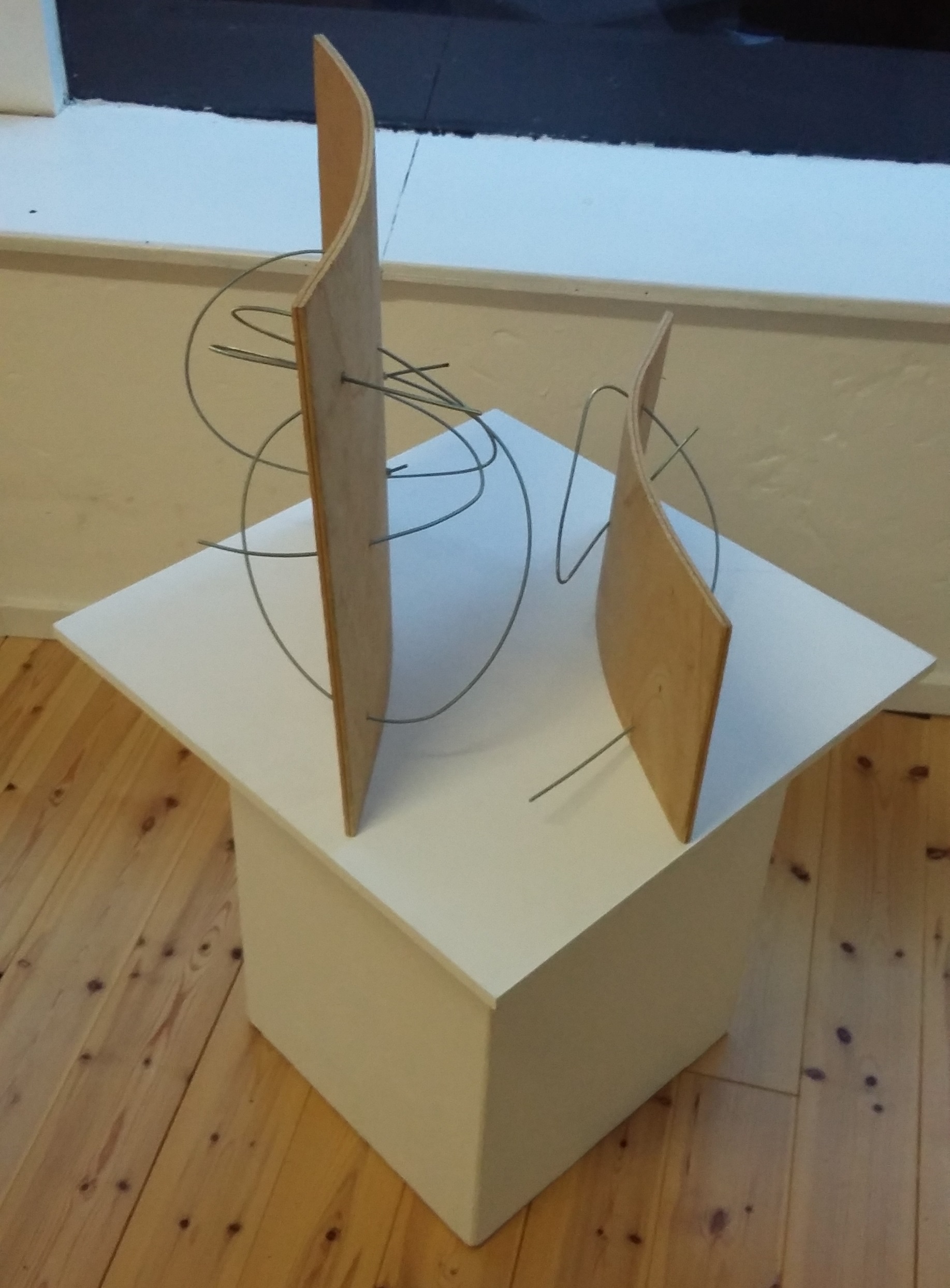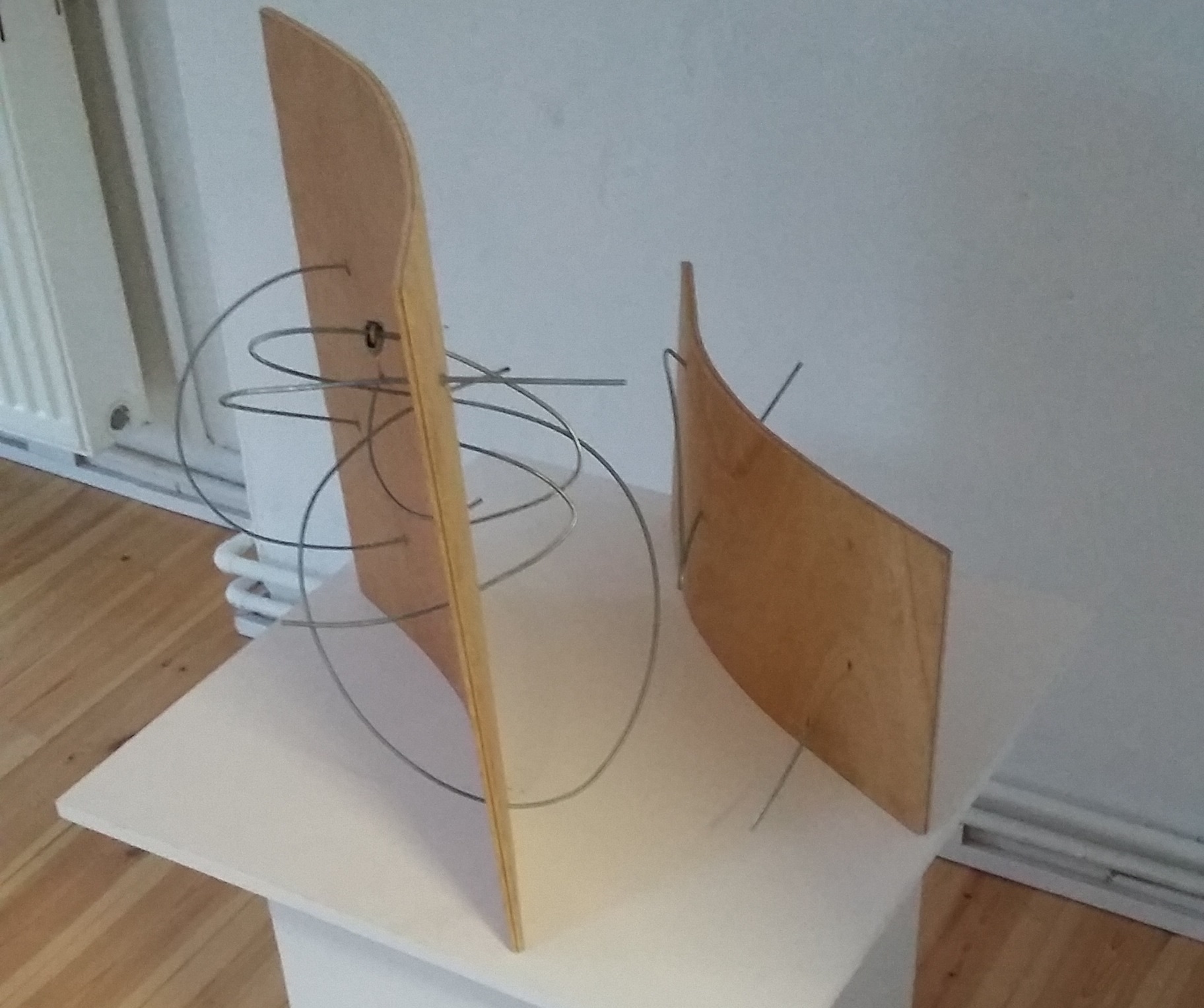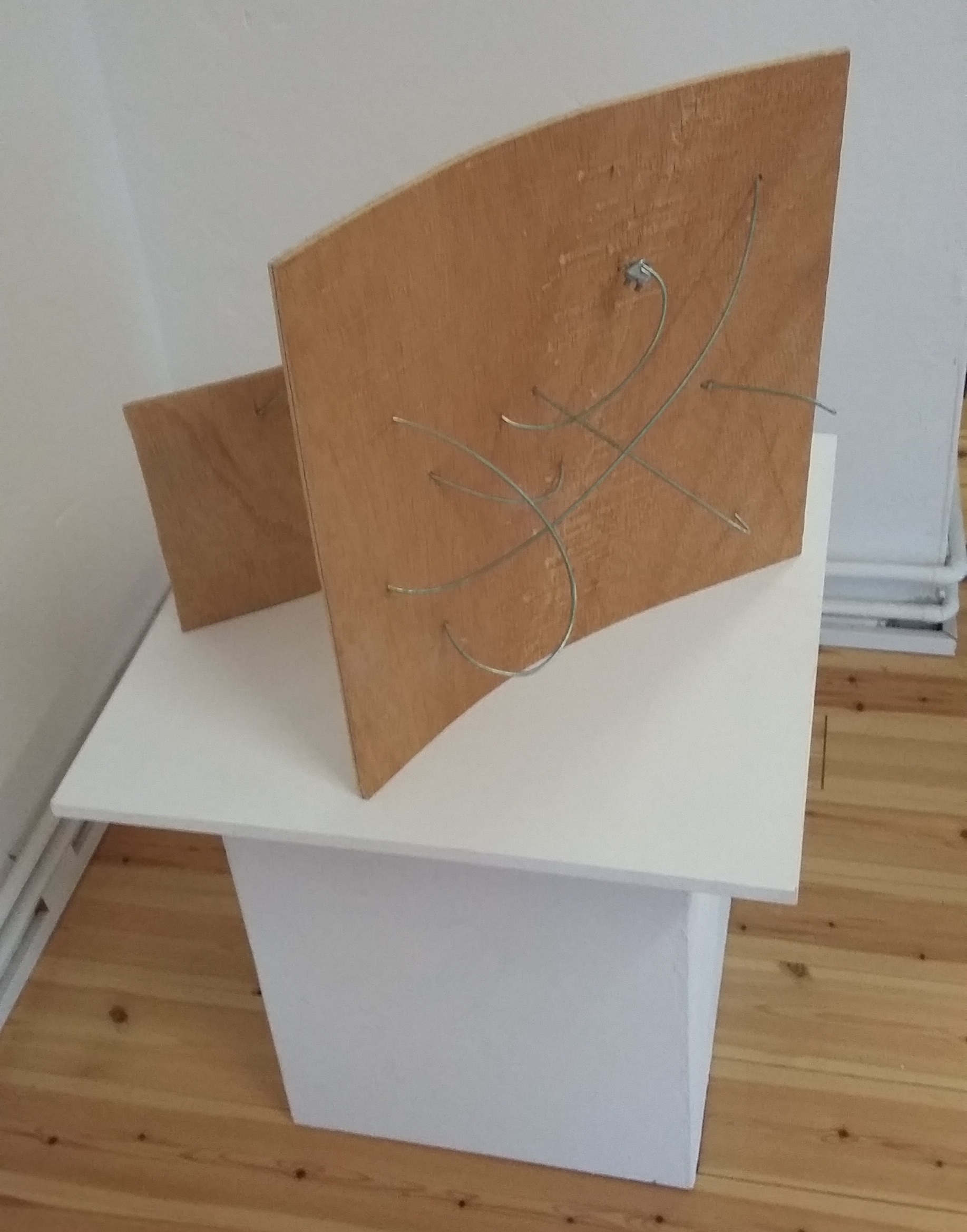 These two small art pieces, collectively titled “Durch Wind und Wetter” (seperately titled “Wind” and “Wetter”) are the result of a process of experimentation with new materials, which I started in the autumn of 2015. I became interested in the material of threaded wire rods because of their intruiging yeilding/unyielding qualities, and in the process of experimentation, combined them with various other materials such as plastic sheets, paper, fabics, stone and wood plates. “Durch Wind und Wetter” constitutes an interesting interplay between two different materials, which in combination form a playful act of tension and flexibility, a kind of struggling dance, resulting in a fragile yet solid balance.
