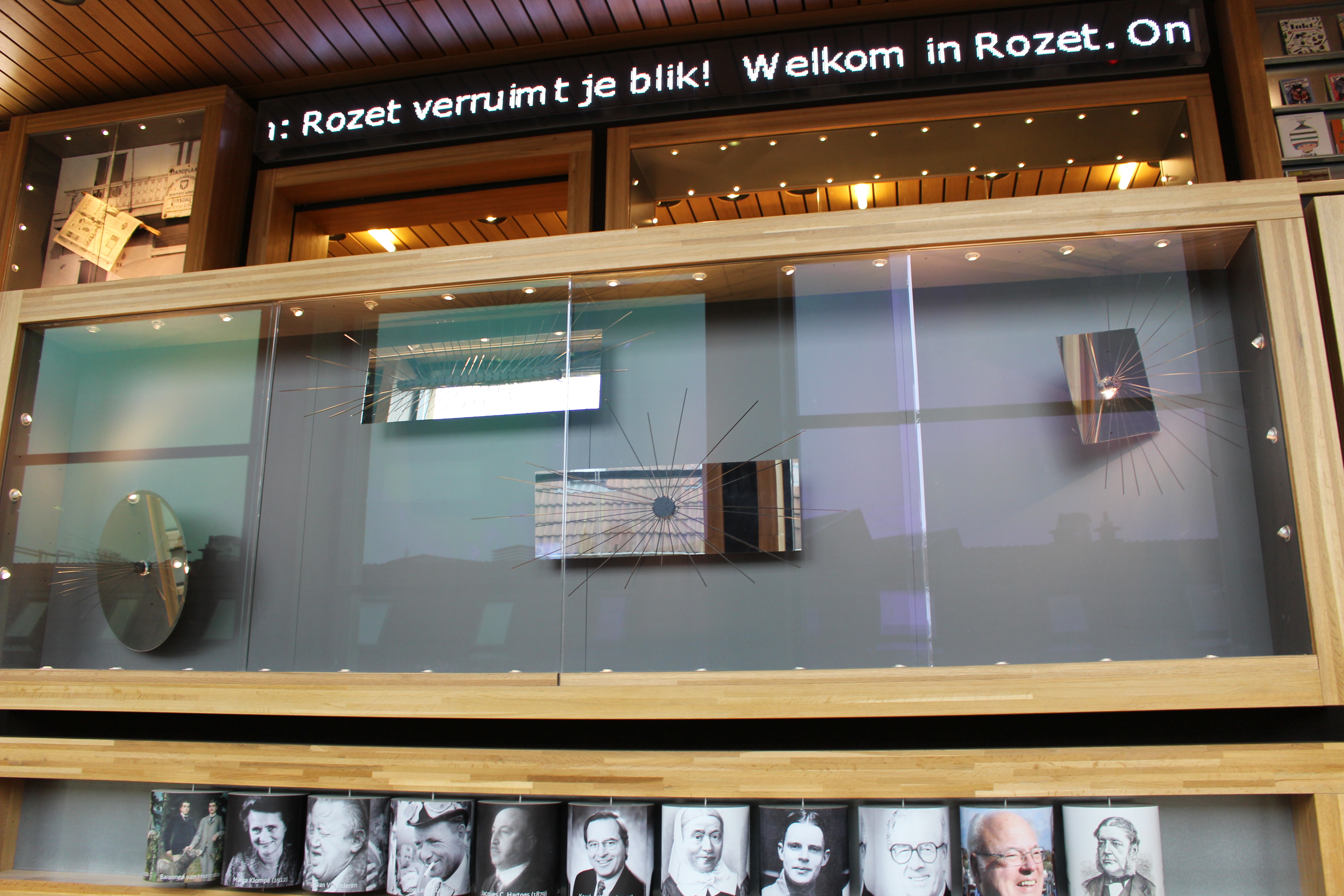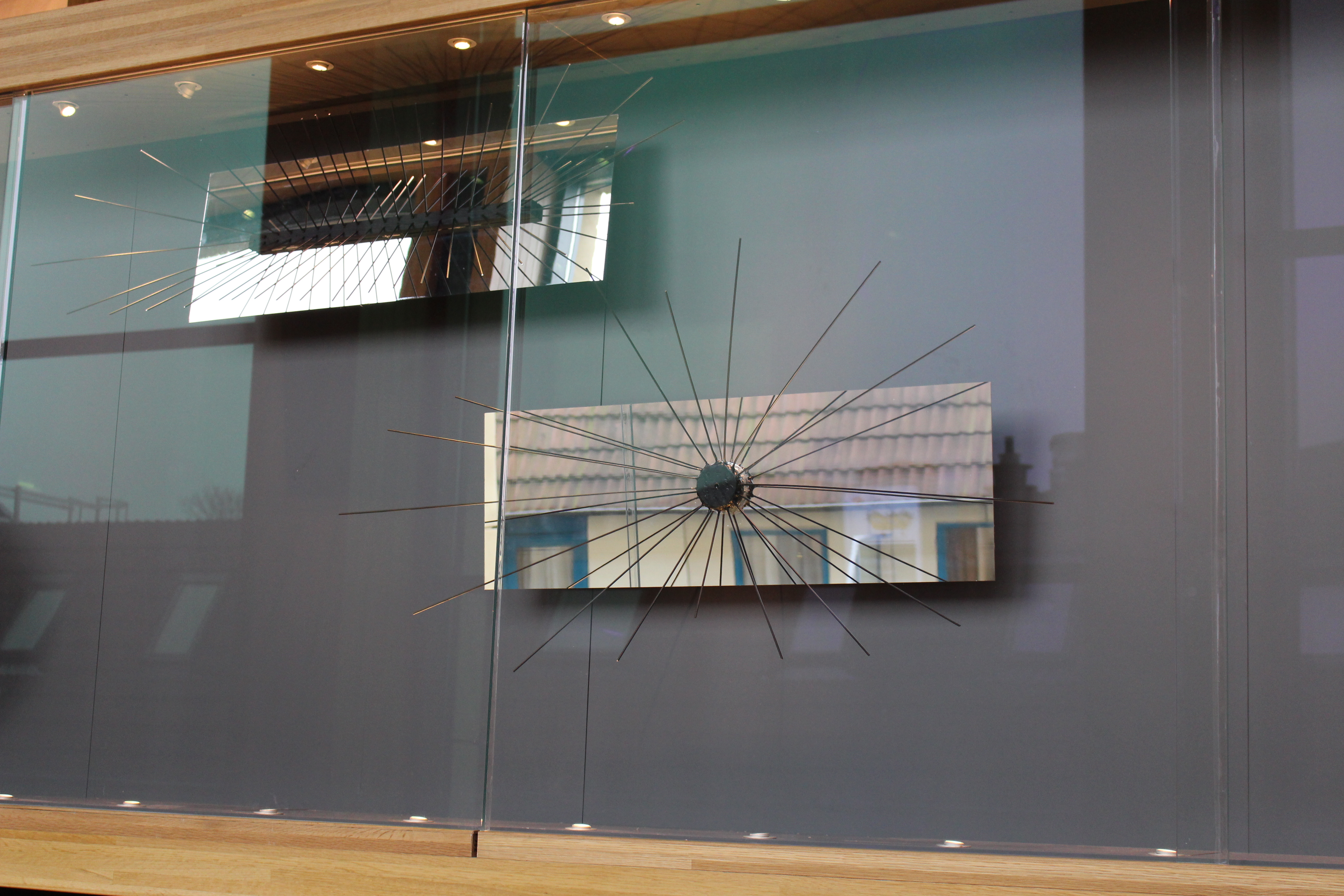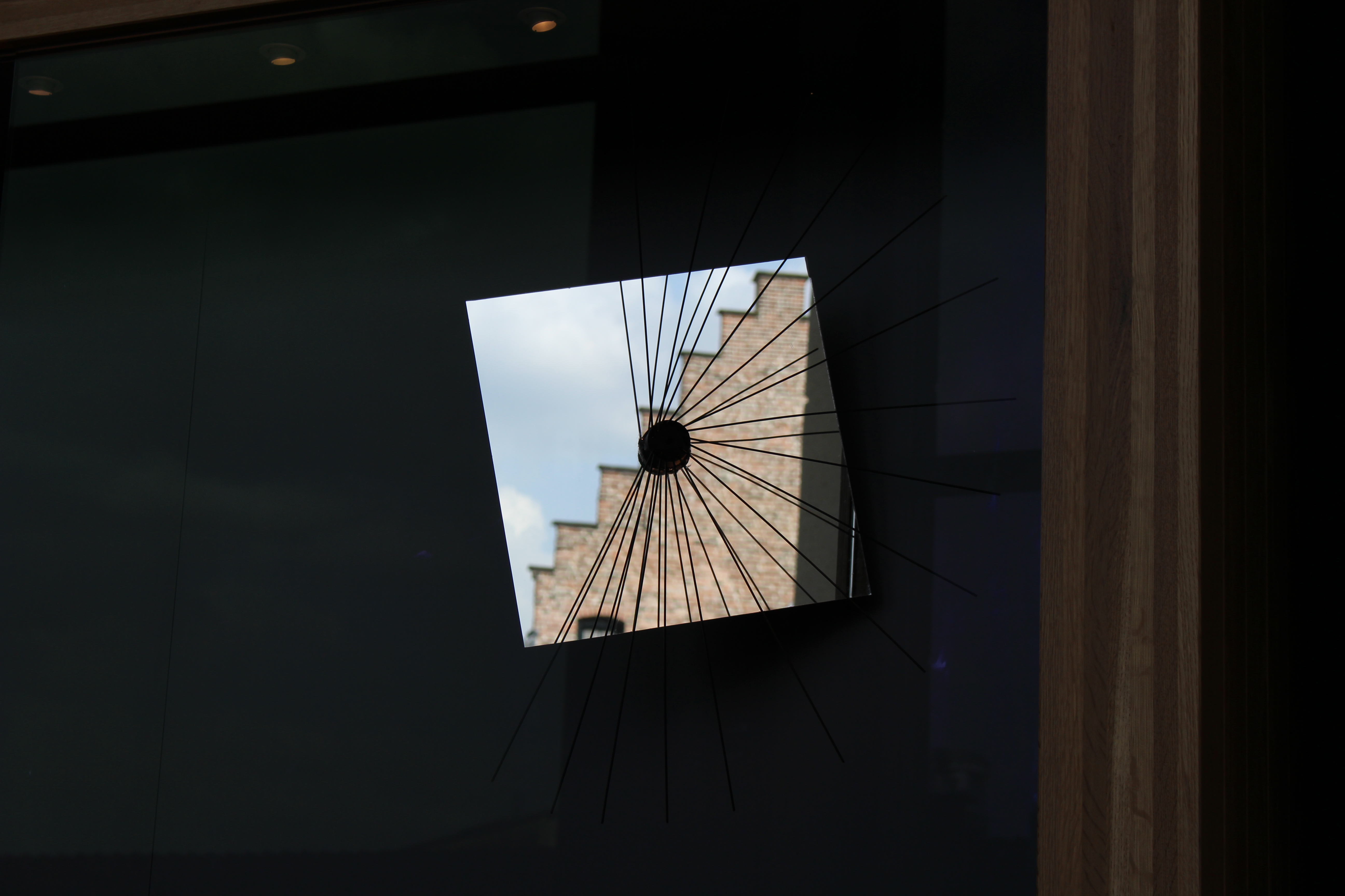 I was approached by Art Rental Gallery “toART” in Arnhem to create new work for one of their glass cases in Rozet: the noted new building in Arnhem which houses several cultural organisations such as the Library, the Heritage Centre and the Art Rental Gallery. This project was especially challenging for me, as I am used to working in and reacting to much bigger spaces than the glass case, which measures 4,5 m in width by 1,3 m in height and is only 30 cm deep. After having observed the glorious architecture and wonderful (invisible) line patterns that surround the glass case, I decided to work with mirrors, which provided me with the opportunity to point to / reflect these views from within the glass case (giving me much more space to work with). Bunches of lines have been attached to the middle of the mirrors, which point to the views reflected in these. The four objects work as an installation within the glass case, and the reflected views constantly change as the visitors climbing and descending the stairs are passing the case from left to right and vice versa. No matter which views are reflected though; the bunches of wire always point to the line patterns visible in the views reflected in the mirrors. An extra layer is that these bunches are line patterns in themselves, pointing to (invisible) line patterns in the reflected views of the mirrors (which in turn also reflect the line patterns which are the bunches of wire). This work is on display all through the summer up to September so be sure to check it out if you’re in the vicinity of Arnhem.