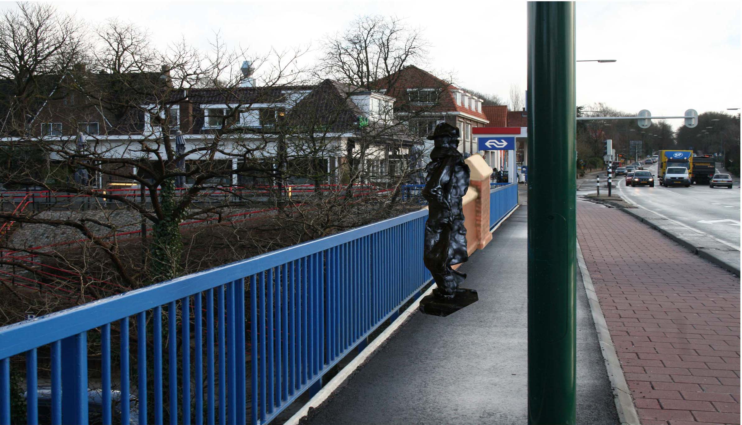 Het is alweer bijna twee jaar geleden dat ik in de bus zat onderweg naar Rhenen om daar foto’s te maken van de brug over de spoorlijn. Ik wilde daar een bronzen beeld maken ter ere van de schrijver Nescio. In zijn “Titaantjes” beschrijft hij hoe de hoofdpersoon Koekebakker mijmerend aan deze brug staat, en beschrijft hij het uitzicht: “In Rhenen stond ik in de schemering op de brug over den spoorweg en keek naar ‘t Noorden. In de diepte lag de spoorlijn tot den gezichtseinder, aan beide zijden er van rees de berg steil op, begroeid met lichtgroen gras en donkergroene brem vol gele bloemen. Ik keek er naar hoe de bergwanden geleidelijk lager werden, tot ze heel ver, overgingen in de vlakte.”